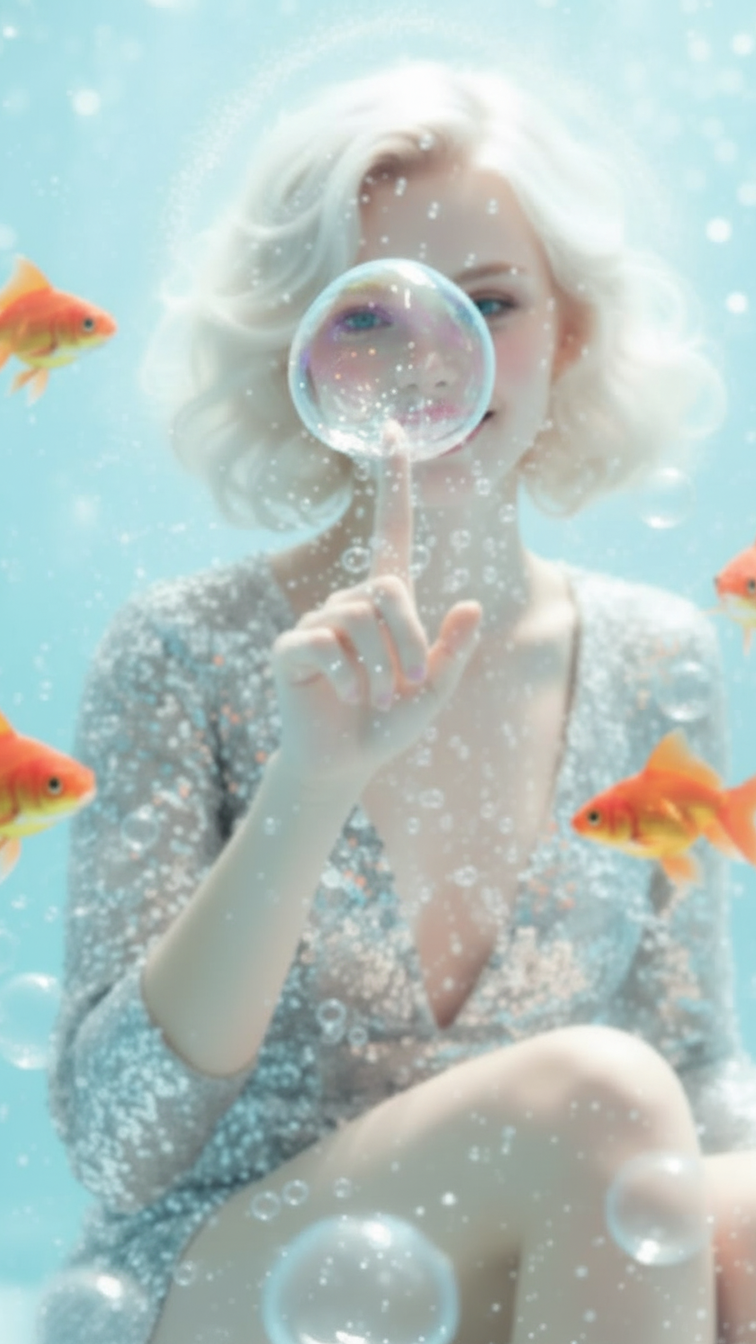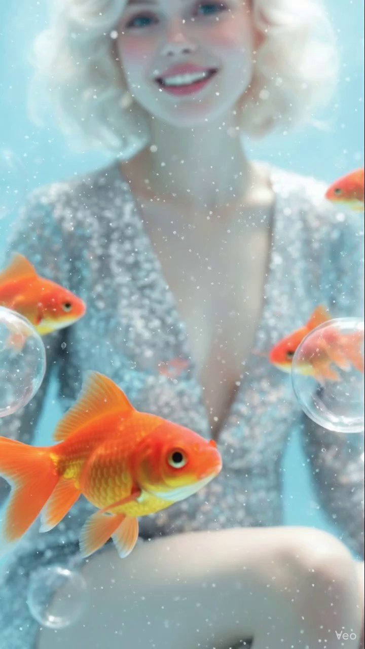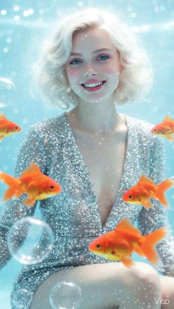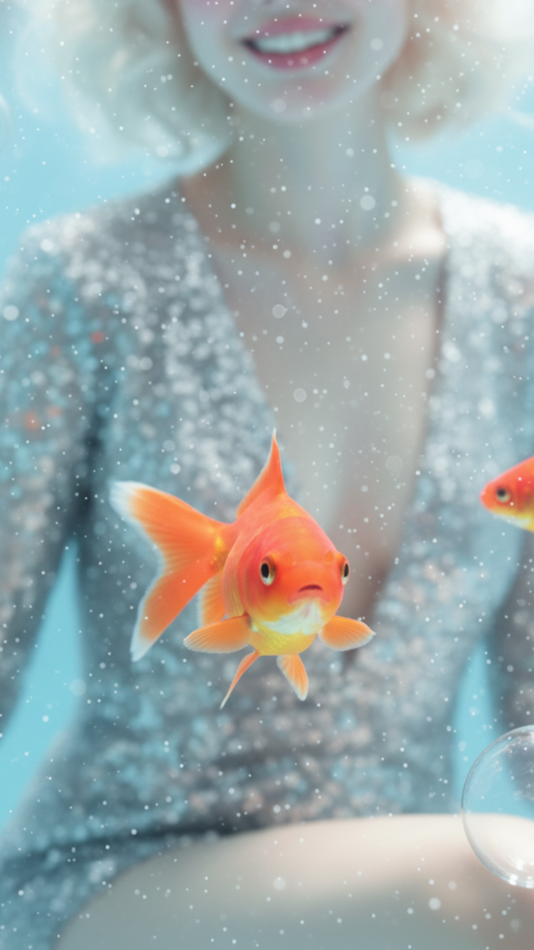 Первым делом — образ русалочки. Я перебрал несколько вариантов и остановился на этом образе. Короткая прическая, блондинка, золотые рыбки и сверкающее платье.